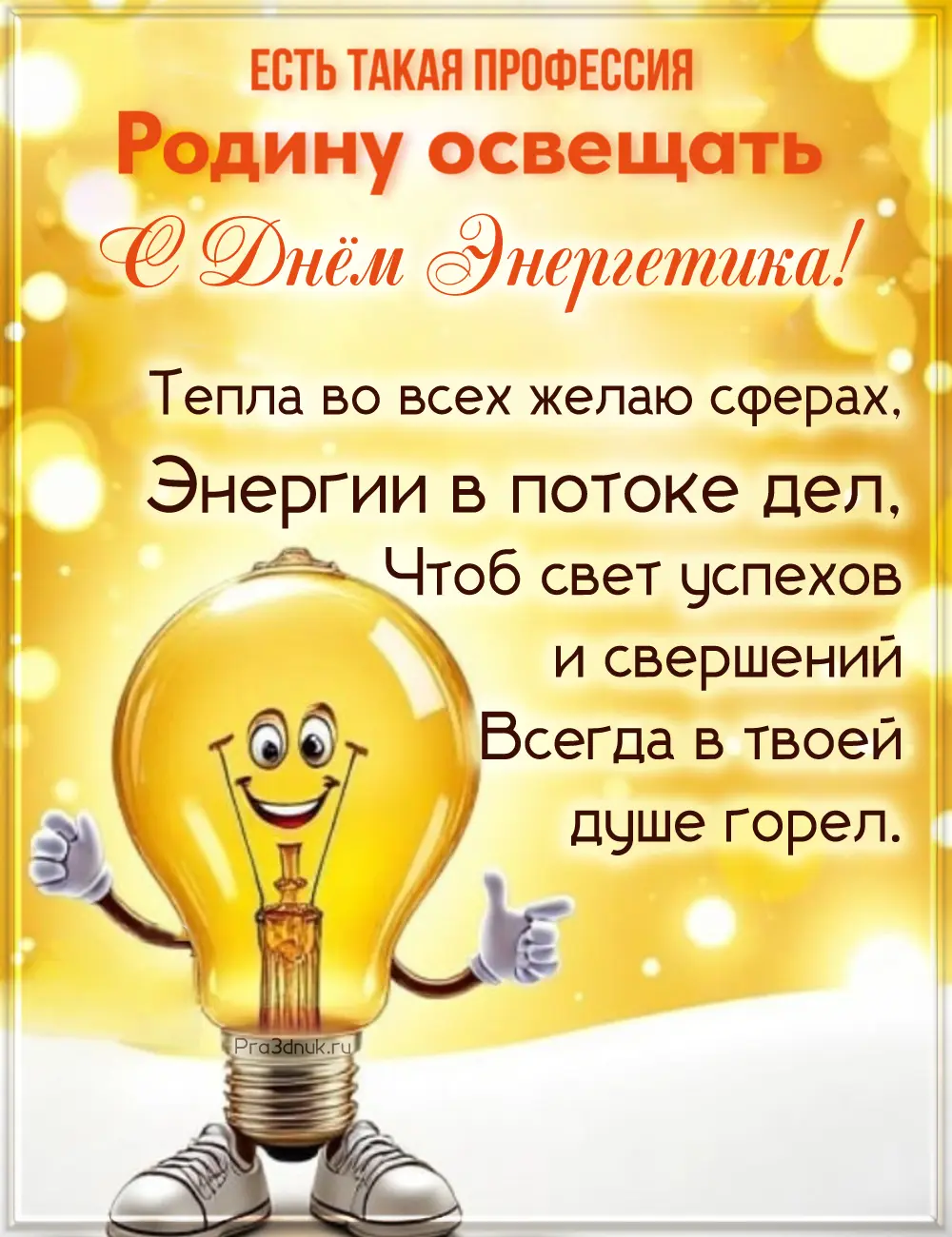 Как энергия, которая проникает в каждый дом и каждое сердце, вы делаете мир лучше. Ваши достижения в сфере энергетики - это результат вашей фантазии и изобретательности. Пусть каждый ваш шаг будет направлен к новым вершинам технологического прогресса!