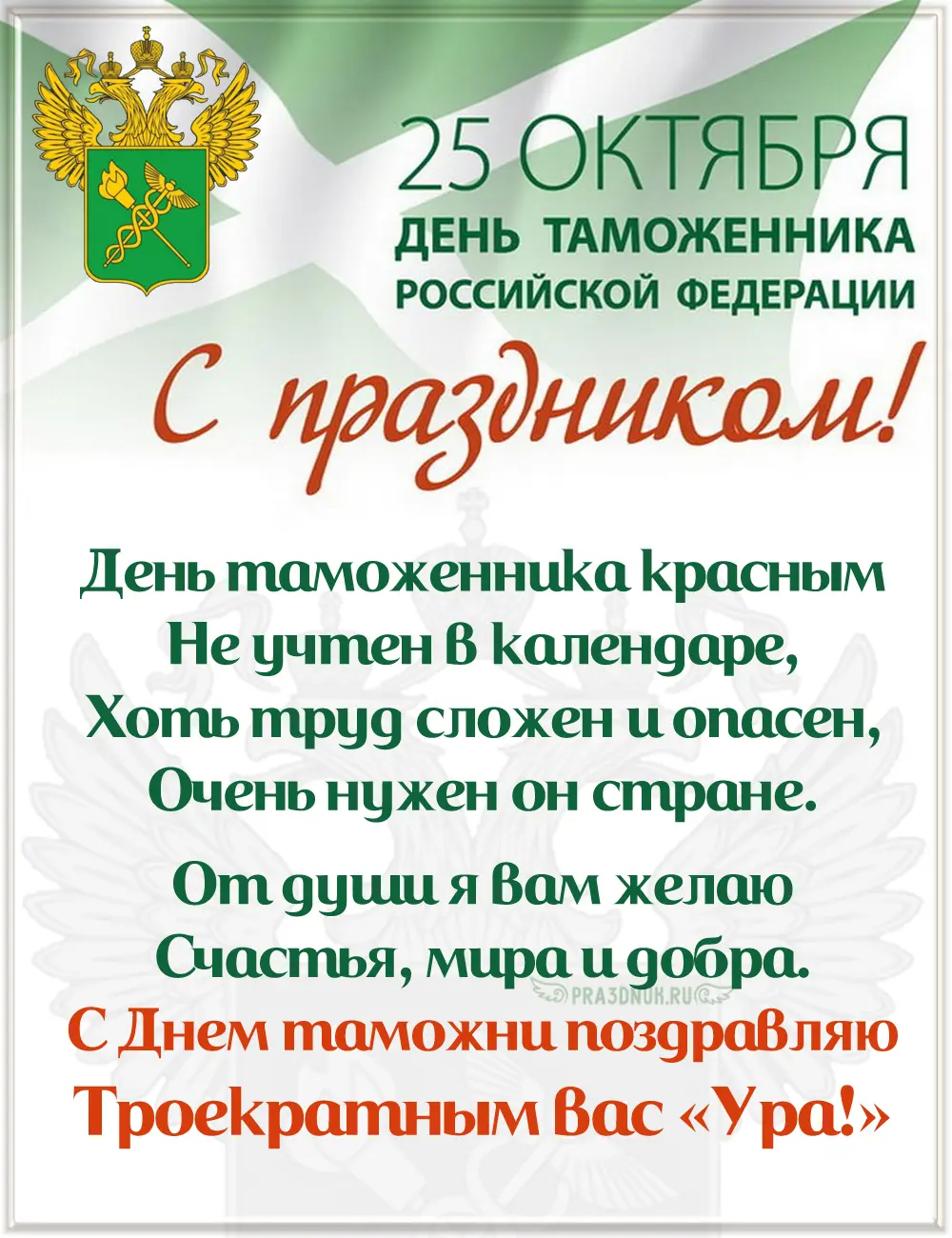 С праздником, дорогие таможенники! От души желаю вам терпения и мудрости в принятии решений, справедливости и точности в выполнении своих обязанностей. Пусть ваша работа способствует развитию внешнеэкономических связей, защите интересов государства и предотвращению незаконных действий. Благодарю вас за ваше нелегкое служение!