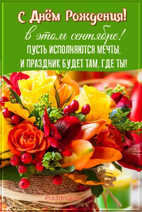С днем рождения, мой дорогой человек! Сегодня в сентябре твой день рождения, и я искренне желаю тебе всего самого прекрасного! Желаю тебе верить в свои силы, не останавливаться на достигнутом, добиваться многого, и чтобы жизнь подарила тебе массу необычных приключений и удивительных впечатлений!